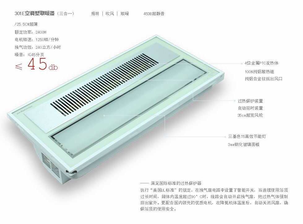 吊頂,已逐漸演變?yōu)榧烙^娛樂(lè)、享受放松和低碳健康等多種功能為一體整體空間,當(dāng)今吊頂裝修從中獲益的不僅是視覺(jué)的享受,還有心靈的觸動(dòng)。在這個(gè)轉(zhuǎn)變過(guò)程中,海創(chuàng)全能吊頂在功能、品質(zhì)上都有長(zhǎng)足的提高,營(yíng)造出了高質(zhì)量的生活品位,并且注重環(huán)保和節(jié)能。 于近期推出的海創(chuàng)新品HCD301E空調(diào)型取暖器,正是符合時(shí)代新特征的熱銷(xiāo)產(chǎn)品。 家庭的“小太陽(yáng)” 4位金屬PTC發(fā)熱體:金屬PTC發(fā)熱材料啟動(dòng)時(shí),因開(kāi)始溫度低,電阻值小,所以輸入電流較大,功率相對(duì)也大,從而使加熱器很快發(fā)熱。然后隨著溫度的升高(如風(fēng)扇發(fā)生故障停轉(zhuǎn)),其電阻值大幅度增大,即以PTC(POSITIVETEMPERATURECOEFFCIENT)特性自動(dòng)修正,使加熱器輸入功率降低,限制加熱器溫度升高。反之,則輸入功率增大。從而自動(dòng)保持溫度基本不變。簡(jiǎn)言之,快速加熱保持恒溫。讓您瞬間擁有屬于自己的“小太陽(yáng)”。 午后的靜謐愜意 45DB超靜音設(shè)計(jì),讓您在享受“日光”的溫暖時(shí)感受到猶如午后般的靜謐愜意,在平衡的感覺(jué)下使肉體和精神得到深度放松。 智能的高端設(shè)計(jì) 執(zhí)行“美國(guó)UL標(biāo)準(zhǔn)”的規(guī)定,在換氣扇電路中設(shè)置了智能開(kāi)關(guān),當(dāng)連續(xù)使用浴頂過(guò)長(zhǎng)時(shí)間,箱體內(nèi)溫度超過(guò)90°C時(shí),線路會(huì)自動(dòng)開(kāi)啟換氣扇,把過(guò)熱氣體強(qiáng)制排出室外。更配合國(guó)內(nèi)領(lǐng)先的優(yōu)質(zhì)電機(jī),在降低機(jī)體溫度后,自動(dòng)關(guān)閉風(fēng)扇,確保浴頂?shù)氖褂冒踩? more+