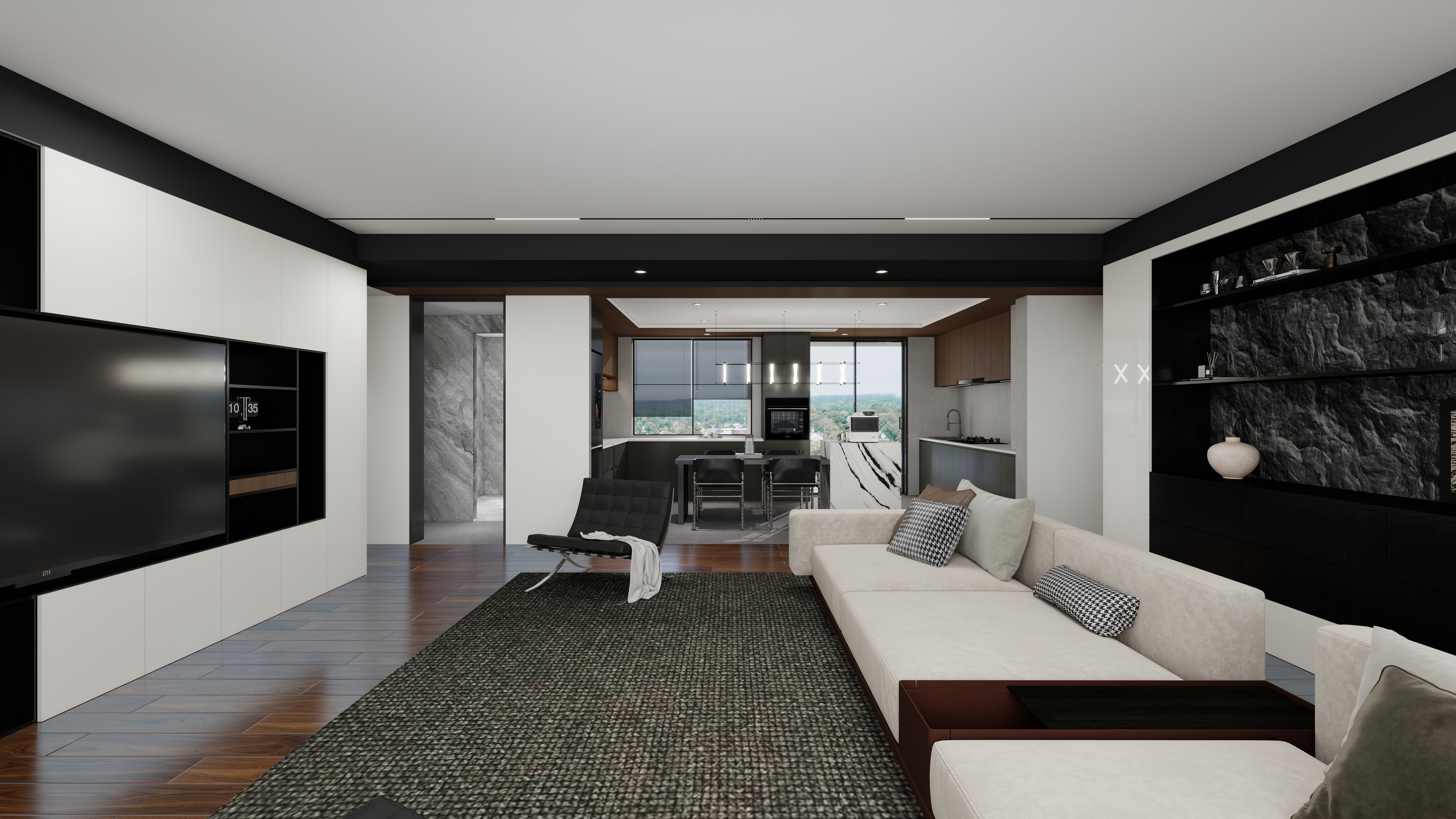 這套120㎡的居所,以侘寂美學為底色,通過頂墻門柜極致的黑白對比,勾勒出空間的清晰輪廓與深邃層次。黑,并非純粹的暗色,而是沉穩(wěn)的錨點;白,也非簡單的空曠,成為呼吸與光影的畫卷??蛷d:定制的秩序感客廳的雙背景墻均采用頂天立地的定制柜體,以內嵌形式消弭冗余。黑白柜面交織拼接,如同精心裝幀的書卷,在提供海量收納的同時,刻畫出立體而干凈的空間輪廓,奠定沉穩(wěn)大氣的基調。餐廚區(qū):圍合的溫度場采用開放式圍合布局,空間通透流暢。視線可毫無阻隔地延伸至廚房,讓家人備餐時的身影與笑語成為最動人的風景。一組深棕色的木質吊柜恰到好處地點綴其間,其溫潤的質感瞬間柔化了黑白的冷峻,為空間注入一絲暖意與高級感。玄關:延伸的巧思雖尺度精巧,卻通過延展式布局與半開放設計,巧妙化解局促。它既是歸家儀式感的起點,也高效承載了日常進出所需的收納,功能與形式達成微妙平衡。書房:專注的結界書房是黑白對比最為鮮明的場域。極致的色彩分割摒除一切紛擾,營造出冷靜、純粹的思考環(huán)境,有效提升專注力,讓精神在此迅速沉潛。臥室:織就的安寧雙臥室延續(xù)黑白主調,并以深淺不同的棕色調和,交織出寧靜而舒適的睡眠氛圍。舍棄傳統(tǒng)飄窗布局,釋放出更多可利用空間,讓休憩體驗更為寬松自在。主衛(wèi):理性的升華主臥衛(wèi)生間采用同色系一體化設計,大理石墻面與蜂窩板無縫銜接。獨特的線性美學頂面設計,在純粹的黑白與利落的直線中,將功能與理性美學升華至新高度。在這里,生活被還原成一種素樸的儀式。每一處設計都服務于居住的本質——在鮮明的對比中尋得平衡,在質樸的材質里觸摸溫度,最終刻畫出一個鮮明、從容、充滿理性與深情的生活現場。more+