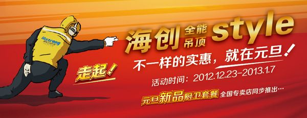 2012年12月23日-2013年1月7日,海創(chuàng)全能吊頂再次掀起新一輪活動(dòng)熱潮,為全國(guó)消費(fèi)者送上“元旦新品廚衛(wèi)套餐”,帶來一廚一衛(wèi)元旦特惠價(jià)1980元!