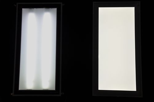 照明對比:左為琥珀系列節(jié)能燈產(chǎn)品,右為琥珀系列LED純屏燈產(chǎn)品