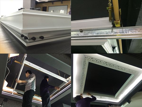 首先是地面工作,在平整的地面上完成海創(chuàng)Smart復(fù)式角線框,并完成框上三角龍骨的安裝。待所有地面工作完成后開始頂上作業(yè),確定Smart復(fù)式角線內(nèi)框的安裝位置,在偏離框外2公分左右確定膨脹螺栓的四個(gè)基準(zhǔn)點(diǎn),確定吊頂高度,依次安裝角線、絲桿、主龍,再把之前安裝好的海創(chuàng)Smart復(fù)式角線框上到頂上,依次裝上外圍鋁板,安裝內(nèi)側(cè)鋁板,先裝兩邊再裝中間。