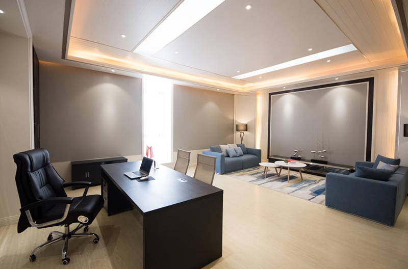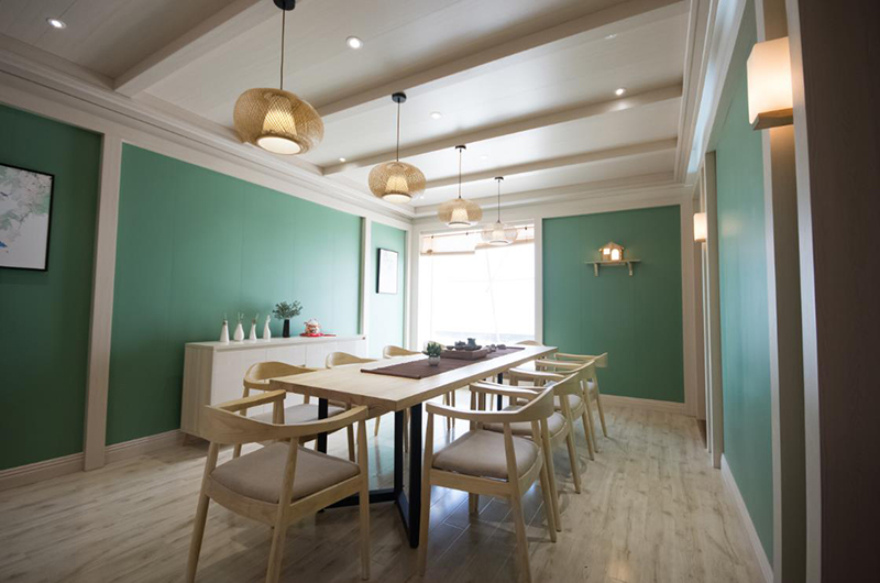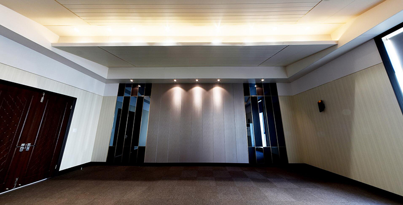 2017年,海創(chuàng)商學(xué)院增設(shè)了設(shè)計、安裝等培訓(xùn)科目,內(nèi)容由淺入深,一年多以來共培訓(xùn)了200多家門店,300多位學(xué)員。而這間會議室正是為商學(xué)院準(zhǔn)備的,此后的培訓(xùn)將能在自己展廳進(jìn)行,以便更加直觀更加深入。會議室頂部使用竹木墻板,打造波浪形的錯層效果,既達(dá)到吸音效果,又讓會議室呈現(xiàn)得莊重大氣。