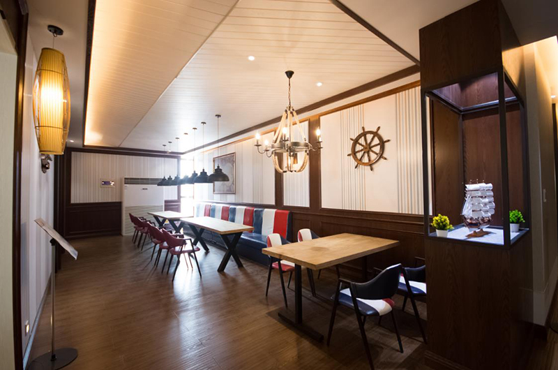 過道盡頭順勢做了一間咖吧,從轉(zhuǎn)角的船模到深處的大航海地圖,不難看出它的海賊王主題,從家具到燈飾都是濃濃的復(fù)古工業(yè)風(fēng)。條紋的墻板和座椅相呼應(yīng)協(xié)調(diào),鮮艷的紅藍(lán)色還帶有一種幽默的卡通味道。頂部的條形板模仿船艙的夾板,傾斜的拼法是為了制造海上的搖晃流動感。昏黃的燈光營造出酒吧咖吧所需要的迷離氛圍。
