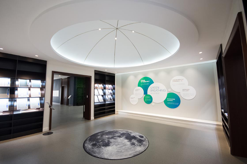 展覽室處于整個建筑的軸心位置,需要穩(wěn)定的格局,除了采用了全對稱的布局外又設(shè)置了一個球形的頂形成了類似羅馬建筑的制高點,其造型猶如一個未打開的觀星臺,設(shè)計師以此刻意制造了一種意境的延伸感,使得觀者行至此處都會駐留片刻,潛意識中隱隱等待著一種升華。