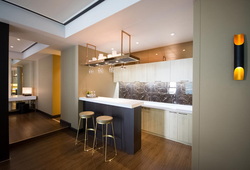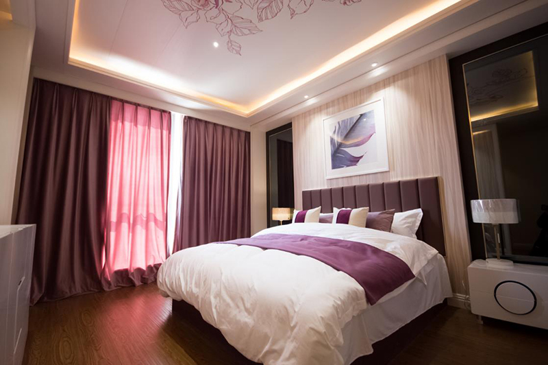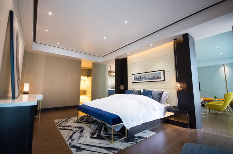 皮衣之都海寧地處富庶的江南,不僅文化底蘊豐厚且現(xiàn)代感十足,是一座人口不多卻非常時尚摩登的城市。設(shè)計師把“輕摩登”的概念植入到了這套頗有國際范的公寓式酒店客房。簡潔大氣的造型,完備精致的功能決定了此套客房的高檔次。大量運用的皮革硬包墻面,時尚貴氣的墻紙加上閃爍的玫瑰金亮面,更強化了奢華的氛圍。湛藍(lán)色的布藝軟飾和黑白的時裝攝影又帶入了一分現(xiàn)代和時尚。