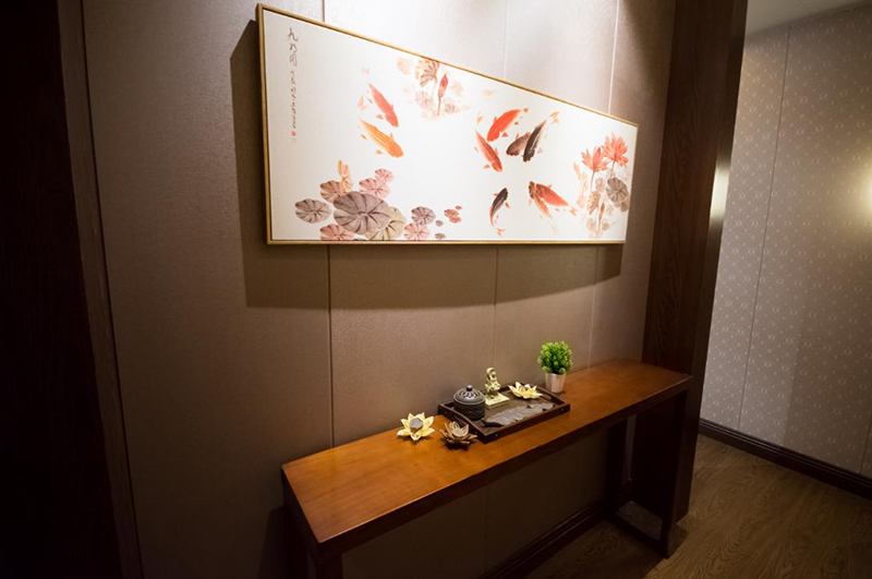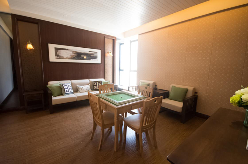 去過重慶的人都說還沒下飛機就已經(jīng)聽到麻將聲,雖然夸張,但是四川人愛打麻將確是出了名的。在四川,麻將館更是鋪天蓋地,卻是很少有把麻將館也裝修的如此考究的,大概多少還知道玩麻將是不務(wù)正業(yè),所以設(shè)計師特意掛上一掛鐘提醒在麻將娛樂的同時也不要忘了回家。另外,這間麻將包廂從墻面到軟搭還頗具民國時期特色,入口還設(shè)置了一幽靜處不僅起到緩沖作用,還能焚香以求手氣順。門口外布置了一座流水觀音把霉運擋在外面,也能暗示人們化解心中功利。