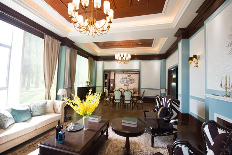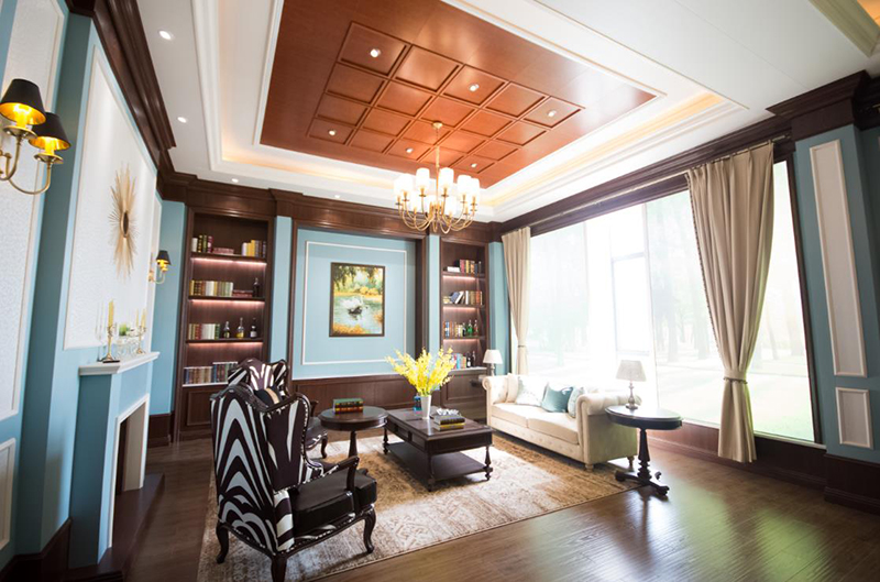 英式風(fēng)格嚴(yán)謹(jǐn)而莊重,體現(xiàn)著優(yōu)雅知性的紳士風(fēng)度。通常整屋不留空隙地運用老榆木線板結(jié)構(gòu)來做裝飾,雖然檔次較高,但是沉重有余而輕松不足,不太符合當(dāng)下開放自由的社會主旋律。所以在設(shè)計此案例時選擇了水藍(lán)色和白色來改變厚重的印象,讓它更加生動又兼具優(yōu)雅,同時質(zhì)感和層次也更加細(xì)膩。整體造型和功能上保持了英式的莊重典雅和知性的文化格調(diào),特別是有那一分薩克斯般的爵士味。