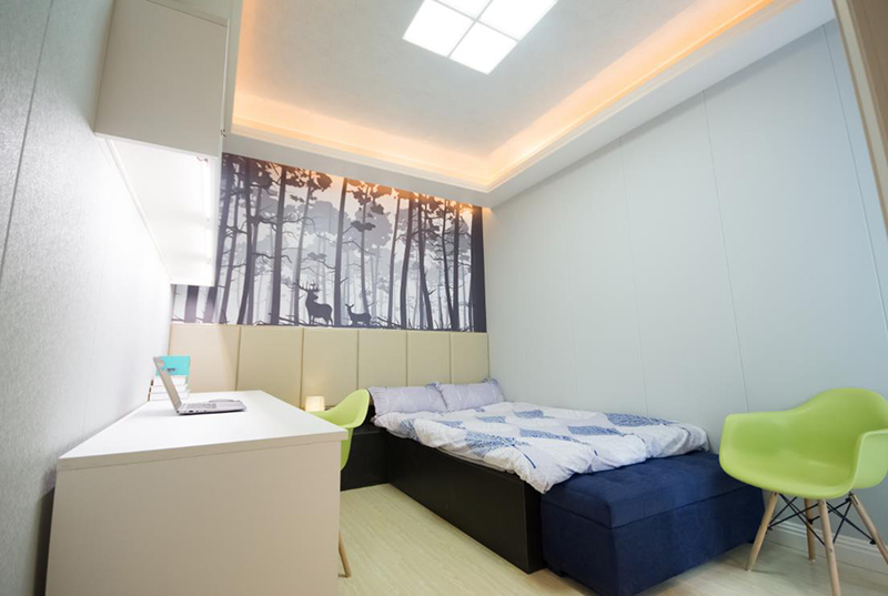其風(fēng)格簡約,格調(diào)清新,床頭背景的大幅3D打印暗示著自然寧靜的氛圍,與墻面的清灰色形成統(tǒng)一的印象,木紋的色彩清淡,紋理自然,頗具親和感,定位給青年旅舍十分恰當(dāng),如果稍加更換顏色和畫面,又可以變換成另外一種主題。