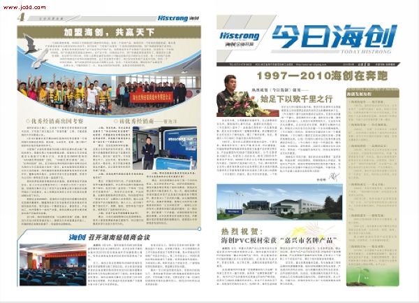 《今日海創(chuàng)》定性為季刊,每個季度的第二個月初出版,分為四個版面報紙在面向經(jīng)銷商和消費者提供公司產(chǎn)品介紹的同時,也會采納讀者的建議和意見不斷完善報紙的內(nèi)容和版面。