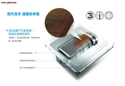 酷睿系列風(fēng)暖電器選用了金屬PTC發(fā)熱體,作為取暖器的核心器件。與傳統(tǒng)的燈暖模塊相比,金屬PTC發(fā)熱體最大的特點(diǎn)是安全可靠,升溫迅速,只需數(shù)分鐘即可達(dá)到洗浴溫度。它由兩組發(fā)熱模塊組成,最大功率2400W,配有延時(shí)器、溫控器和熱熔斷裝置各一塊。溫控器可自動(dòng)偵測(cè)溫度變化,如風(fēng)扇電機(jī)故障無法送風(fēng),或取暖器內(nèi)部溫度過高,金屬PTC可自動(dòng)減小功率,以保持合理的安全溫度。即使風(fēng)扇電機(jī)停機(jī)和金屬PTC自動(dòng)調(diào)節(jié)功能失效,達(dá)到一定溫度時(shí),熱熔斷器也會(huì)自動(dòng)熔斷,只保留一組發(fā)熱模塊正常工作,保證高度安全。