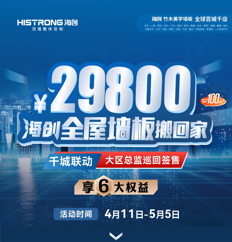省錢的機(jī)會來了!海創(chuàng)千城聯(lián)動 大區(qū)總監(jiān)巡回簽售千萬回饋·墻購51·提前省如果您正在考慮裝修那么一定要來海創(chuàng)看看51提前省、大區(qū)總監(jiān)全國巡回簽售豪禮不停鎖定名額、勁抽好禮100%中獎1元秒殺、現(xiàn)金紅包、超低折扣活動期間下單即有機(jī)會拿到55寸小米電視機(jī)!活動時間:4月11日-5月5日快來報名!有驚喜!海報海創(chuàng)大區(qū)總監(jiān) 51全國巡回簽售鎖定6大權(quán)益1、報名免費參加抽獎活動,100%中獎;2、進(jìn)店即可領(lǐng)取海創(chuàng)定制禮品一份;3、進(jìn)店即可享受免費量房、免費平面布局、免費出實景效果圖;4、報名客戶可享受總部直播間4月19日、4月29日晚上7點1元秒殺和免費抽豪禮活動;5、活動期間下單可享受4月29日晚上7點海創(chuàng)總部直播間抽獎活動,55寸小米電視機(jī)眾多好禮等你來抽;6、享受大區(qū)總監(jiān)簽售專屬特批政策。直播活動額外驚喜福利:第一場4月19日 晚19點第二場4月29日 晚19點掃描下方二維碼進(jìn)入活動頁面海創(chuàng)頂 墻 門 柜 整裝定制選擇海創(chuàng)就“購”了!產(chǎn)品一:8㎡抗油污一廚一衛(wèi)吊頂套餐海報想要...安全環(huán)保、快速入住、省錢又省心海創(chuàng)鋁蜂窩大板一定是你的首選產(chǎn)品二:4m²鋁蜂窩大板廚房套餐海報更多爆款 超低折扣送送送不停產(chǎn)品三:Turbo S 速暖空調(diào)/無界線性暖空調(diào)再送價值1996元4m²鋁蜂窩大板再送價值599元18mm線形燈海報想要...簡約風(fēng)客餐廳、韓式田園臥房快樂城堡兒童房你想要的海創(chuàng)都能幫你實現(xiàn)產(chǎn)品四:8㎡竹木美學(xué)易潔背景墻海報選擇海創(chuàng) 品牌有保障裝修一站就“購”了產(chǎn)品五:海創(chuàng)全屋墻板套餐(限產(chǎn)證面積100平方)海創(chuàng)五一活動千萬回饋·墻購51·提前省全程禮遇超值鉅惠我沖了!??!more+