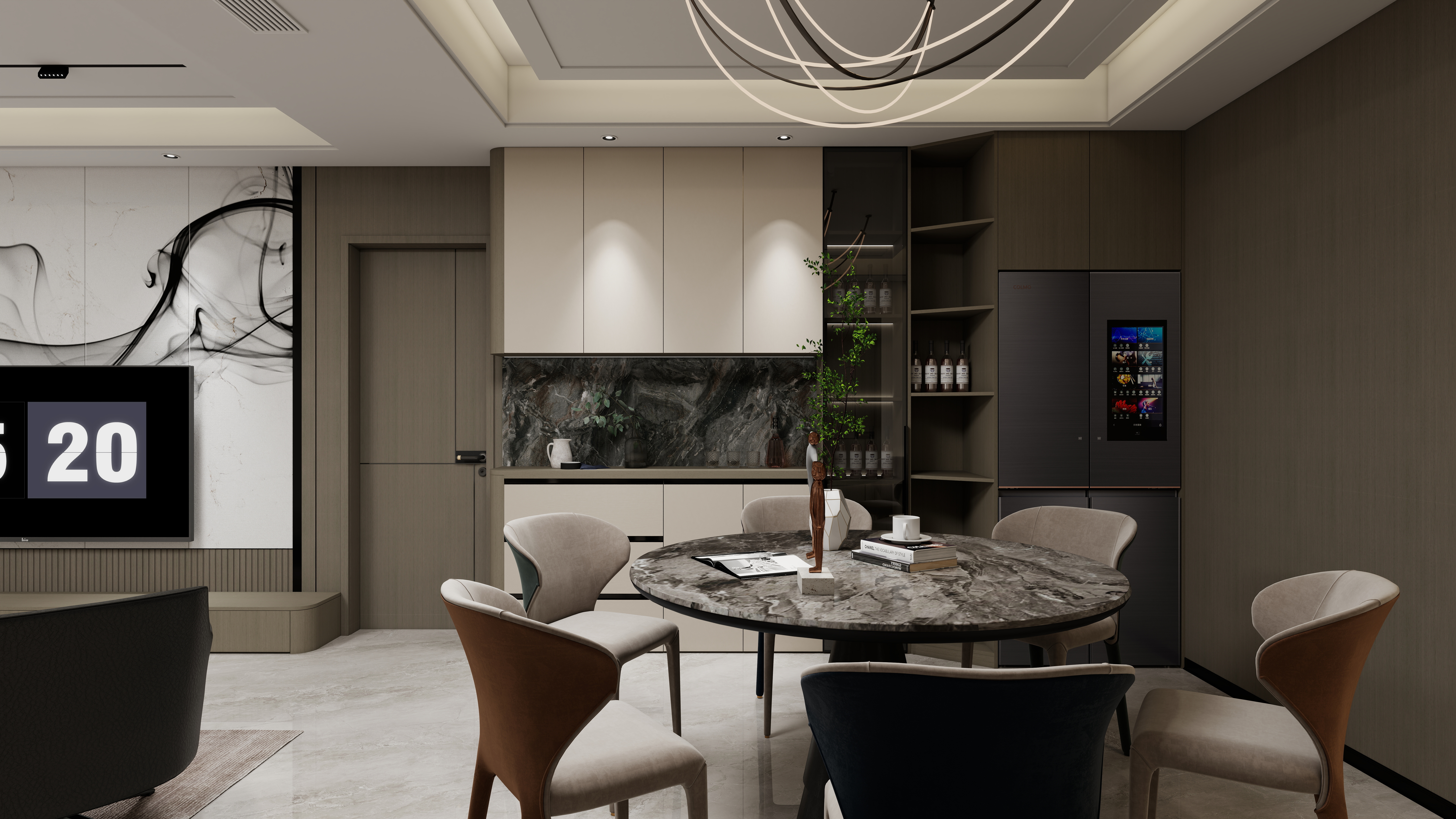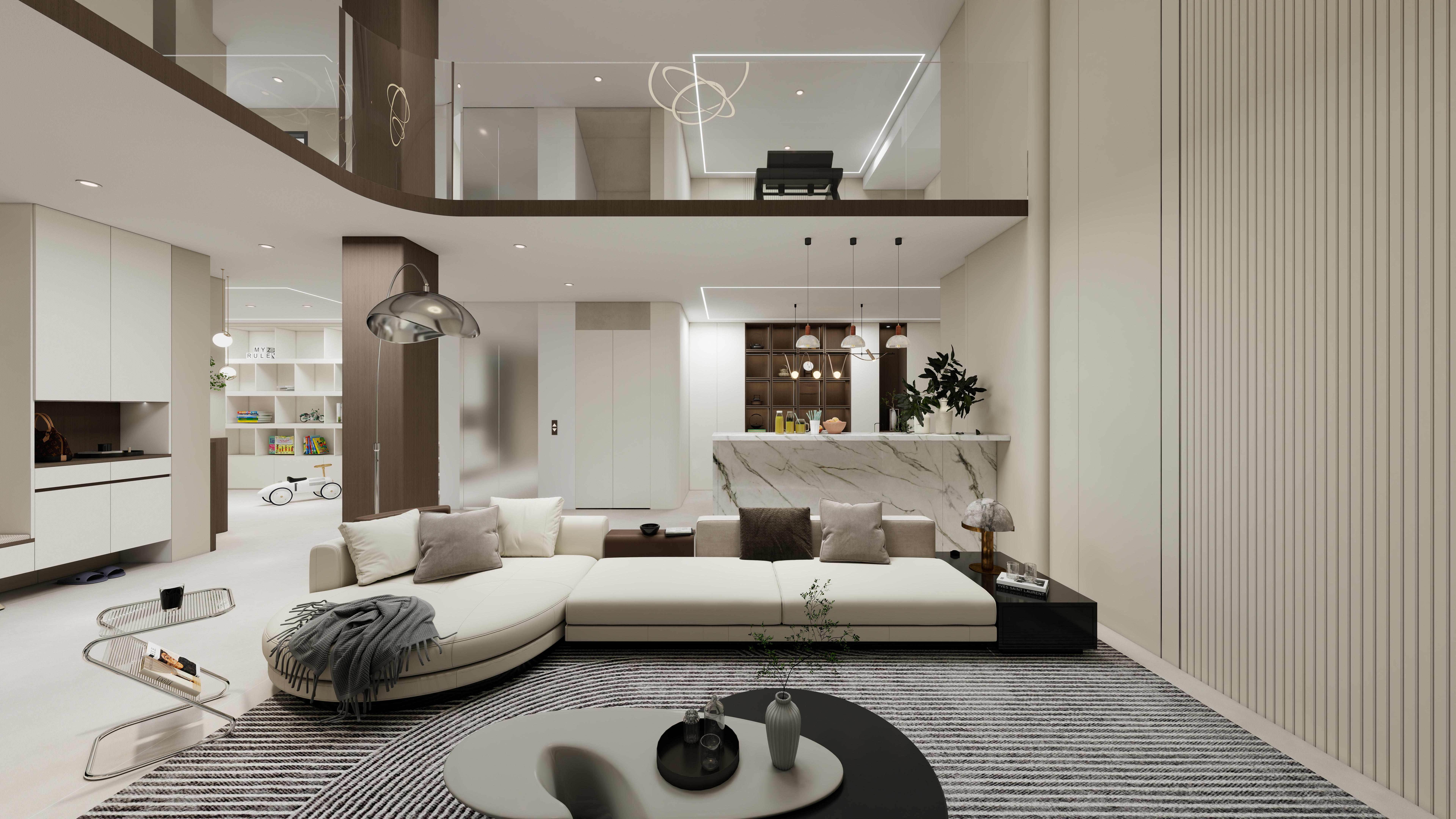 本案以170㎡的敞闊空間為畫卷,執(zhí)筆隱奢極簡的設(shè)計(jì)哲學(xué),為您勾勒一處身心皆安的品質(zhì)居所。我們秉持健康環(huán)保理念,通過頂、墻、門、柜的一體化整合設(shè)計(jì),摒棄冗余裝飾,讓家的每一寸空間都流淌著舒適與寧靜。步入一體化客餐陽區(qū)域,視野豁然開朗。電視背景墻與沙發(fā)背景墻對向而立,與微復(fù)式結(jié)構(gòu)共同撐起大宅氣度。陽臺休閑區(qū)巧妙嵌入,無論是午后品茗還是與友麻將,皆成忙里偷閑的愜意時(shí)光。L型轉(zhuǎn)角廚房動線流暢,與圓桌餐廳形成完美互動;餐廳一側(cè),半開放式奢石餐邊柜成為視覺焦點(diǎn),天然的紋理與溫潤的木色相映成趣,在簡約中暗藏奢華質(zhì)感。私密區(qū)域同樣匠心獨(dú)運(yùn)。兒童房將書桌、衣柜與睡眠區(qū)一體化定制,功能完備且渾然天成,助力孩子專注學(xué)習(xí)與健康成長。主臥與次臥延續(xù)靜謐格調(diào),一門到頂?shù)囊鹿翊钆錁O簡拉手設(shè)計(jì),線條利落純粹,在擴(kuò)大收納空間的同時(shí),極大提升了視覺上的延伸感,營造出令人放松的睡眠環(huán)境。全案通過高級木飾面、定制系統(tǒng)柜與奢石元素的極致組合,不止于視覺上的高級大氣,更致力于為您打造一個(gè)從身體到心靈都倍感健康、安舒與從容的理想家。more+