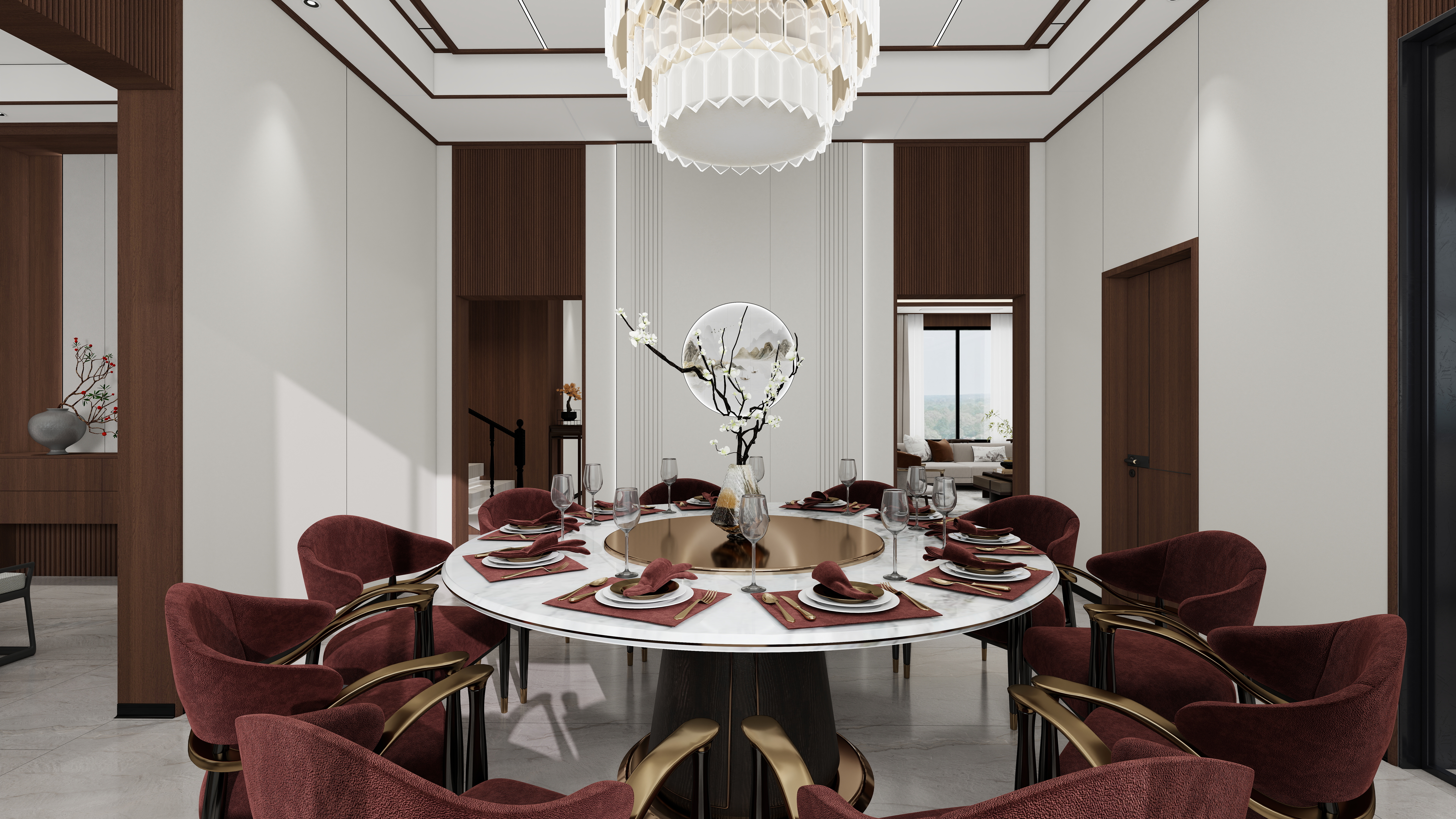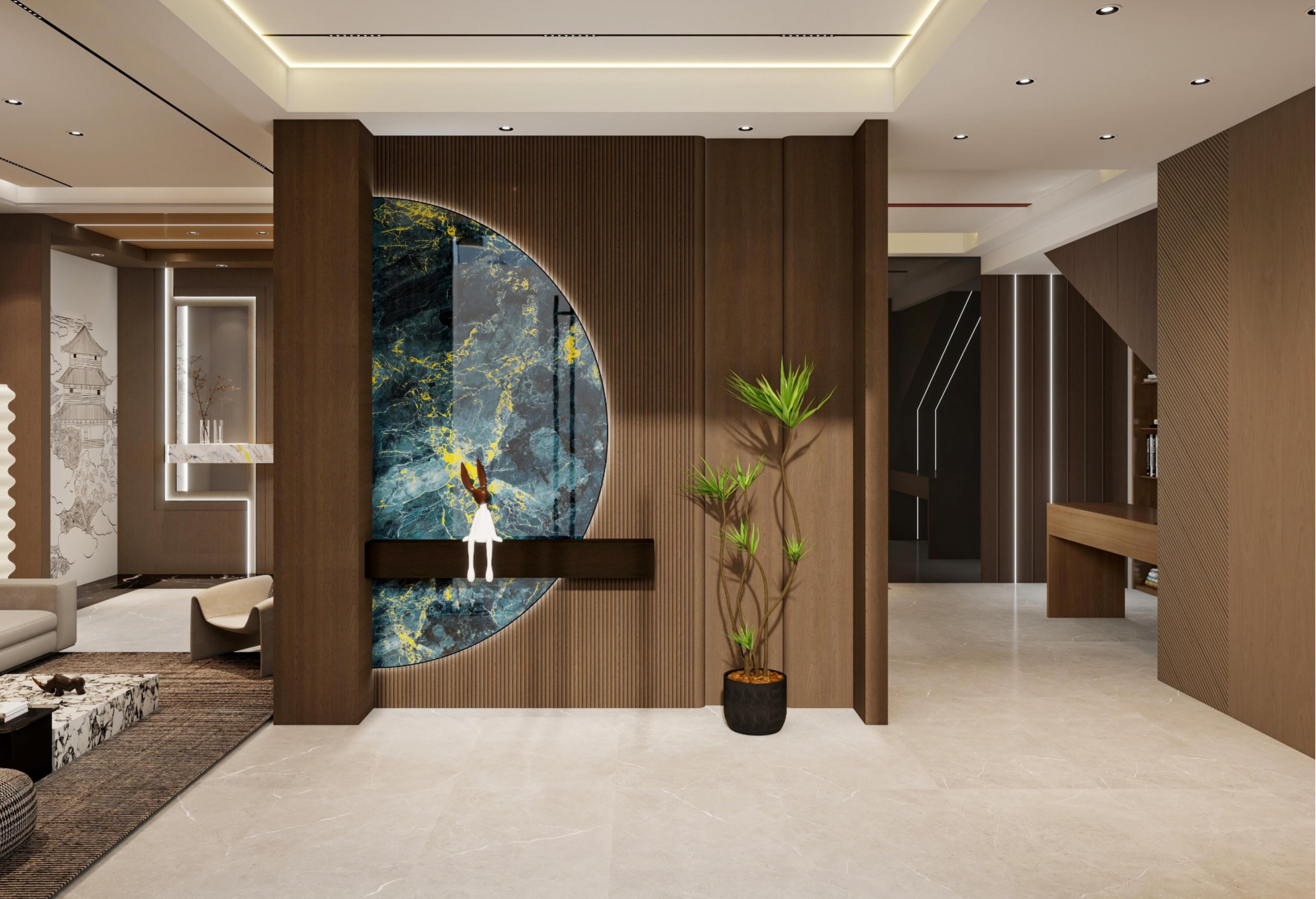 200㎡別墅一層,以頂、墻、門、柜一體化設(shè)計(jì),演繹新中式通透奢華??臻g功能明晰,動線流暢,待客落落大方,處處流露高級品味。超寬敞大客廳頂部采用博格大板與磁吸燈,簡潔有力。錯(cuò)層蜂窩大板吊頂拉伸空間縱深感,配合多元化的電視與沙發(fā)背景墻,盡顯大氣格局。無論宴請還是家庭聚餐,身處其中,怡然自洽。圓桌會客廳背景墻內(nèi)嵌圓形3D打印畫,結(jié)合發(fā)光造型,成為視覺焦點(diǎn),圍合出中式雅聚的儀式感。清雅茶室9A木健康墻板背景懸掛山水畫,木質(zhì)溫潤與畫意空靈相映,營造出一方靜心品茗的禪意角落。廚房三面圍合式布局,高效實(shí)用。鋁蜂窩大板吊頂防潮耐污,搭配上下定制柜,收納強(qiáng)大,視覺統(tǒng)一。休息留客臥室白棕相間的床頭背景溫馨沉穩(wěn),一門到頂?shù)亩ㄖ埔鹿窈喖s利落,功能與美學(xué)兼具。頂層、墻面、門與柜體的協(xié)奏,在這一方空間里收放自如,成就了新中式別墅的奢華氣度與居家溫度。more+