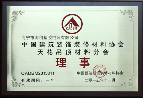 11月,中國(guó)建筑裝飾裝修材料協(xié)會(huì)天花吊頂材料分會(huì)正式授予海寧市海創(chuàng)塑膠電器有限公司天花吊頂材料分會(huì)理事單位殊榮。