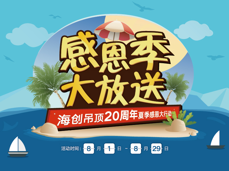 海創(chuàng)集成吊頂特推出20周年夏季感恩大行動,感恩季,大放送,清涼回饋,一“降”到暑。趕快來海創(chuàng)專賣店與大家一起“降暑”吧!