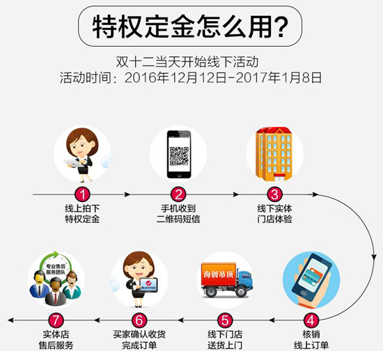 雙十二當(dāng)天登錄天貓海創(chuàng)旗艦店拍下10元特權(quán)定金,到海創(chuàng)門(mén)店消費(fèi)即可抵用100元。特權(quán)定金使用時(shí)間為2016年12月12日-2017年1月8日。