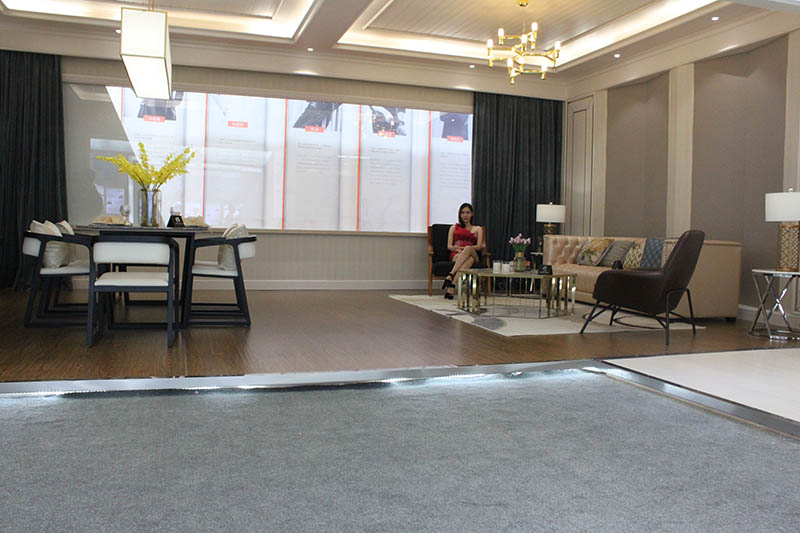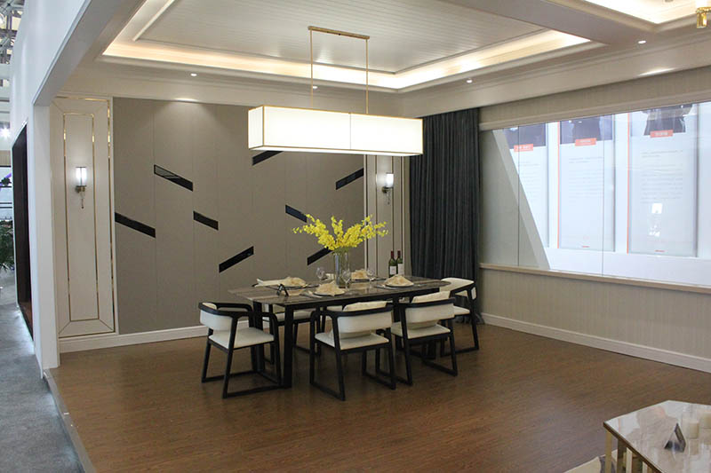 展館入門即現(xiàn)的大面積現(xiàn)代客廳展示精美絕倫,led大燈與回光燈交相呼應(yīng),恍惚間,讓人感覺(jué)仿佛身處一個(gè)家族聚會(huì)的中心??蛷d頂?shù)拇钆淝擅顭o(wú)比,在考慮板材與電器的融洽性的同時(shí),引入柞木碳材質(zhì),有效能吸附甲醛甲苯等有害氣體,美觀與健康兼具。