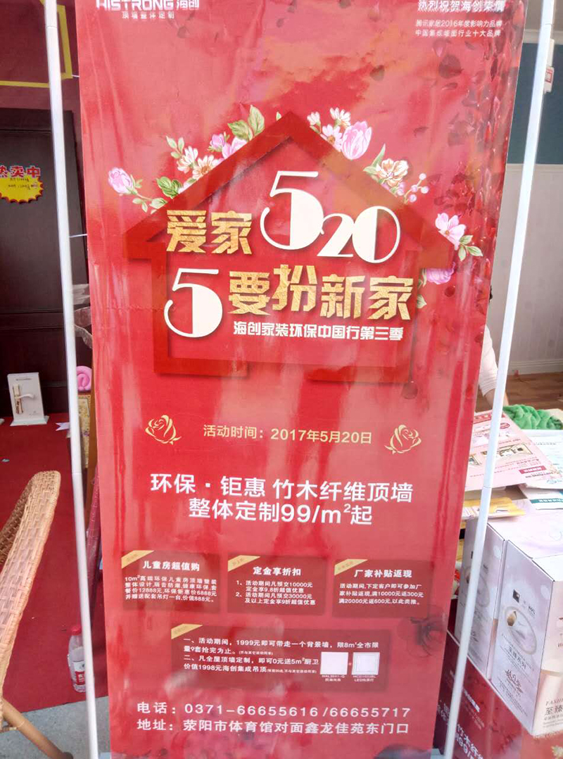2017年5月20日,一場匯聚海創(chuàng)集成墻面、全友家居、雷士照明、容升吊頂等眾多實力品牌的大型家裝建材砍價家博會在河南省滎陽市廣播電視局院內隆重舉行。