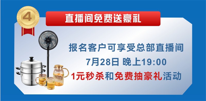4、報(bào)名客戶(hù)可享受總部直播間7月28日晚上7點(diǎn)1元秒殺和免費(fèi)抽豪禮活動(dòng)