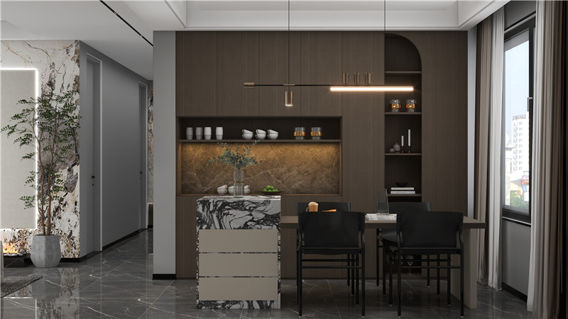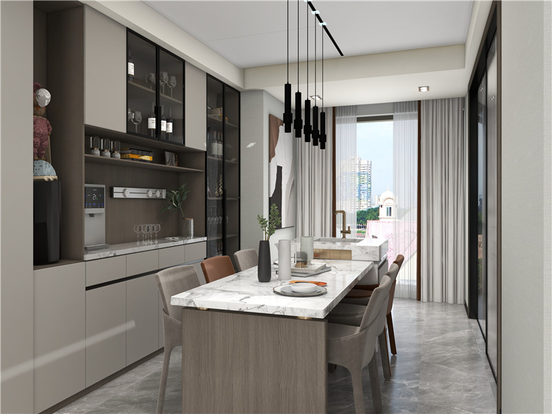 做滿墻餐邊柜,可以讓餐廳看起來更加飽滿,不使用外置拉手,半開放式設(shè)計(jì),既能成為操作臺(tái)面,又能有效完成收納,時(shí)尚簡(jiǎn)約餐廳唾手可得。