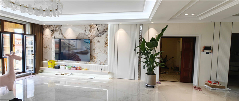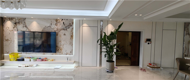 電視背景墻使用高光仿大理石紋結(jié)合格柵打造,簡(jiǎn)約時(shí)尚,倒映熠熠燈光,擴(kuò)大視覺(jué)感,讓空間看起來(lái)更大。