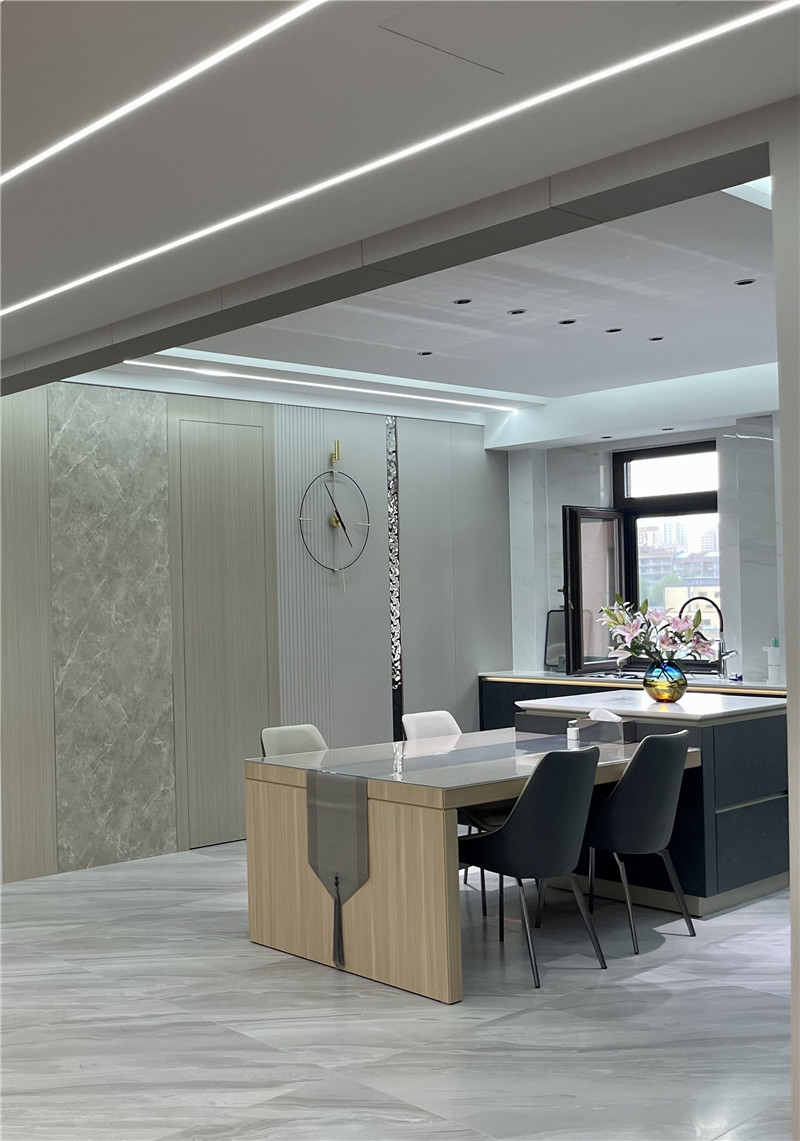 過(guò)道和餐廳是石紋與銀灰色系的組合,沉穩(wěn)內(nèi)斂,潛藏家的深厚底蘊(yùn)。
