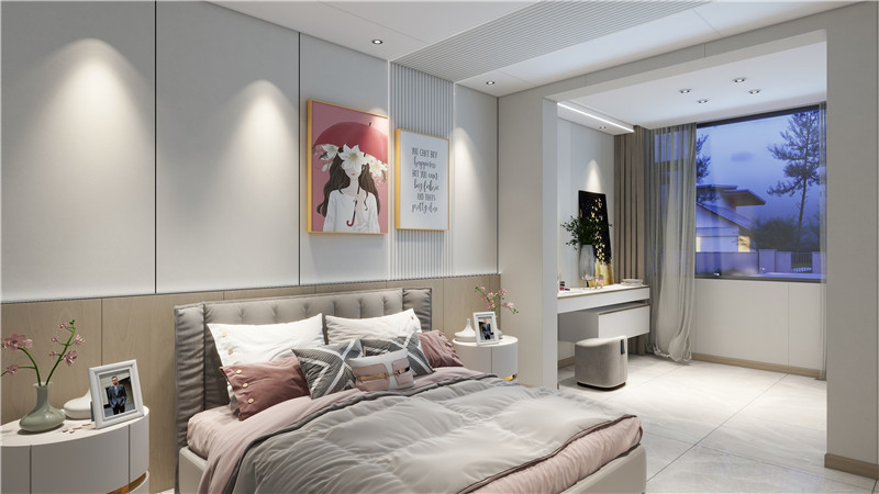 打破傳統(tǒng)飄窗設(shè)計,讓臥室做了簡單的分區(qū),既是化妝間、又是陽臺區(qū),也可以是衣帽間、活動室,增強空間實用性。整體淺色床頭背景,能讓身心快速得到放松。