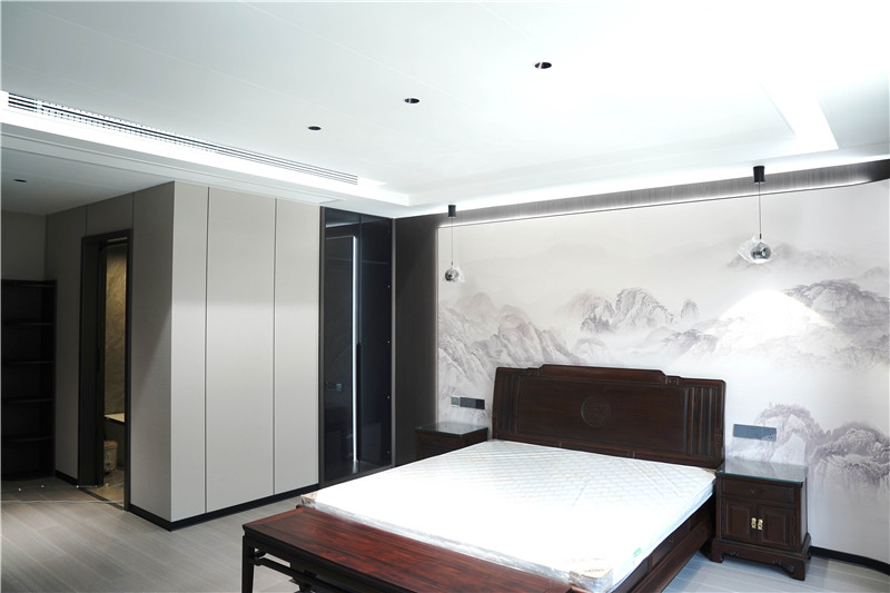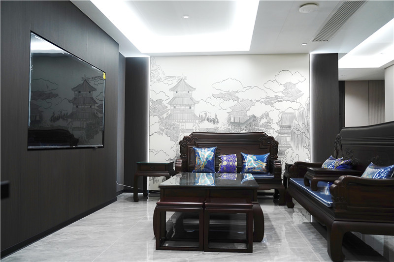 步入客廳,恢弘氣度,空間豁然開(kāi)朗。以9A木上墻做簡(jiǎn)約吊頂,線條利落流暢,與同色系背景墻、定制門(mén)柜無(wú)縫銜接,視覺(jué)延展性極強(qiáng),盡顯開(kāi)闊。背景墻紋理含蓄而富有質(zhì)感,與整體空間色調(diào)和諧共生,奠定新中式沉穩(wěn)大氣的基調(diào)。