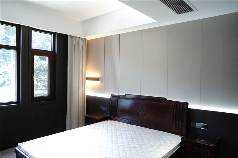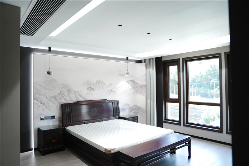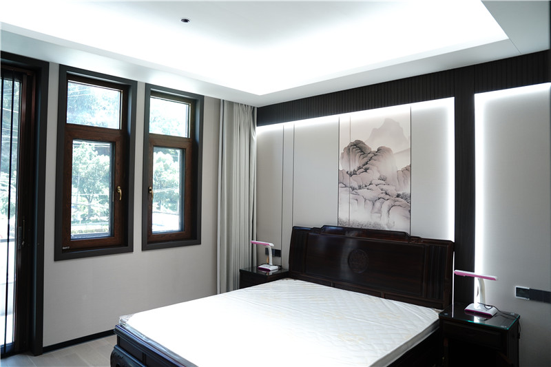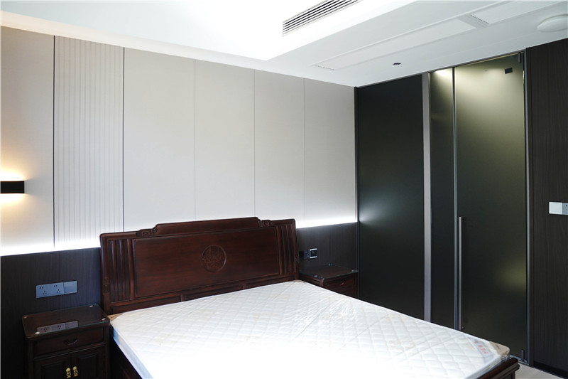 二層作為主要休息區(qū),分布著舒適的客房與主人臥室。海創(chuàng)室內(nèi)套裝門(mén)系統(tǒng)確保了空間的私密與寧?kù)o。步入式衣柜采用頂天立地設(shè)計(jì),門(mén)板與墻面同色同質(zhì),視覺(jué)上形成完整塊面,極大地弱化了柜體的存在感,營(yíng)造出純粹、放松的睡眠環(huán)境。