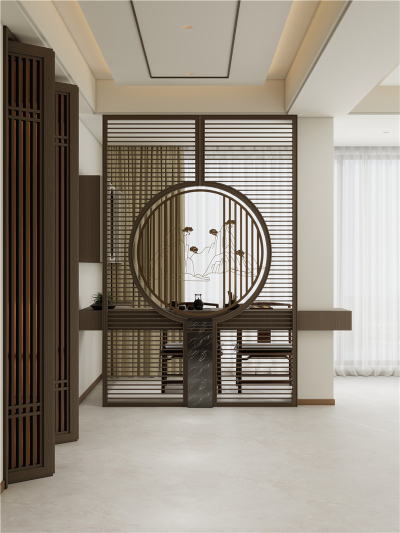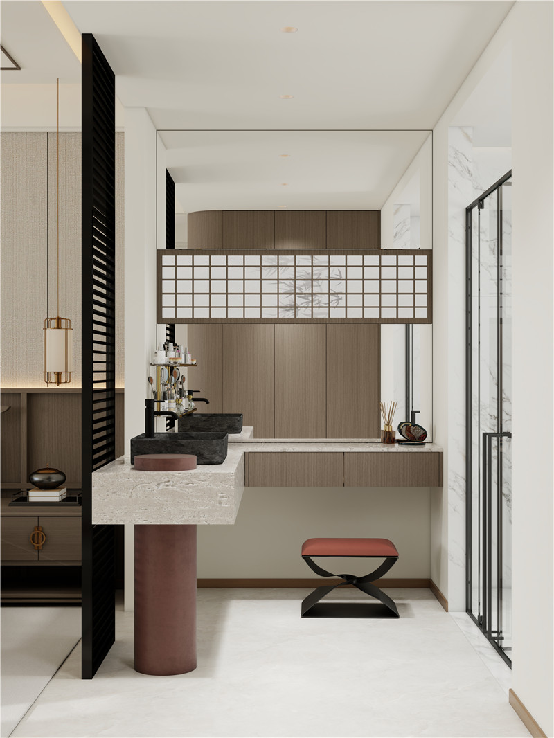 步入挑空大堂,氣派的茶室與客廳相連。海創(chuàng)統(tǒng)一的木質(zhì)肌理與巖板墻面,奠定了沉穩(wěn)中古的基調(diào),這里是家族歡聚、傳承家風(fēng)的核心場域。