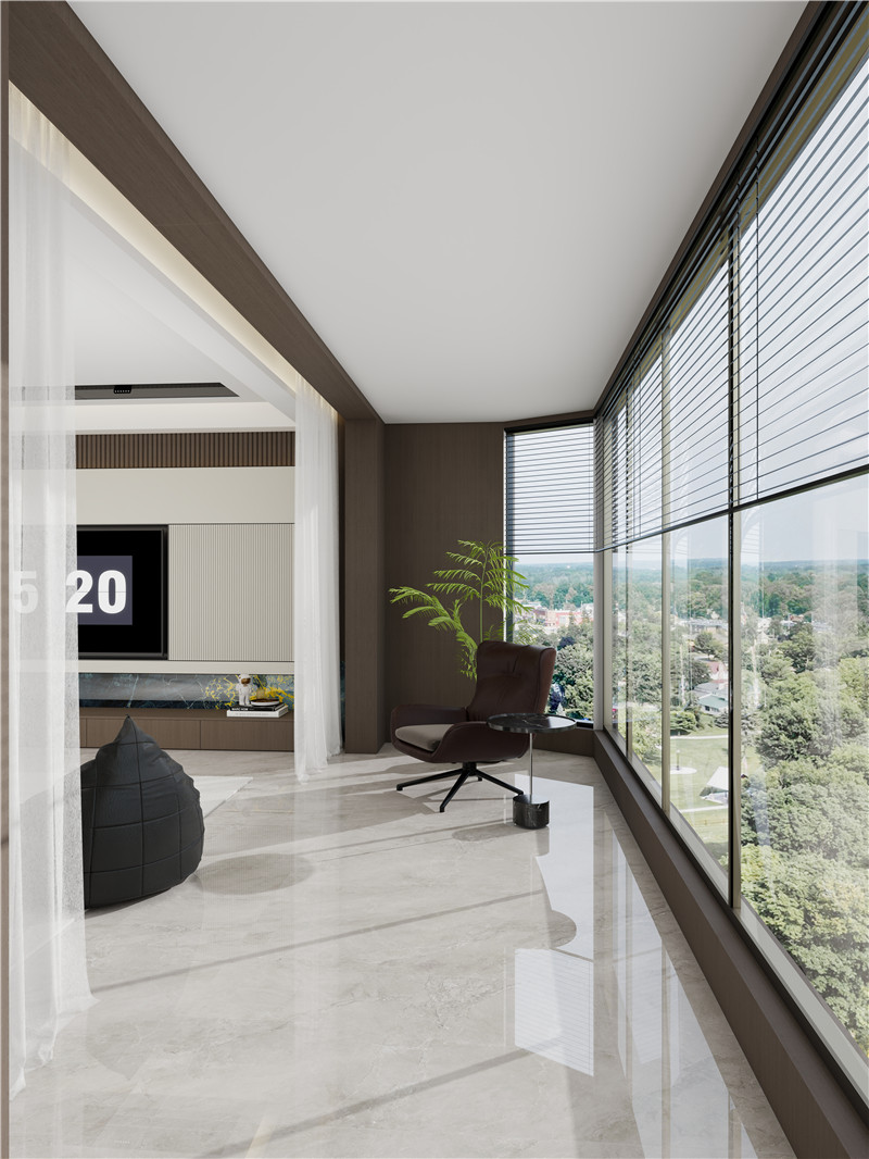 超大環(huán)繞式陽(yáng)臺(tái)將自然光與風(fēng)景無(wú)縫接入室內(nèi),與滿(mǎn)墻電視柜相呼應(yīng)。電視墻以藍(lán)金大理石紋局部點(diǎn)綴,輕奢質(zhì)感悄然流露,成為視覺(jué)焦點(diǎn)。